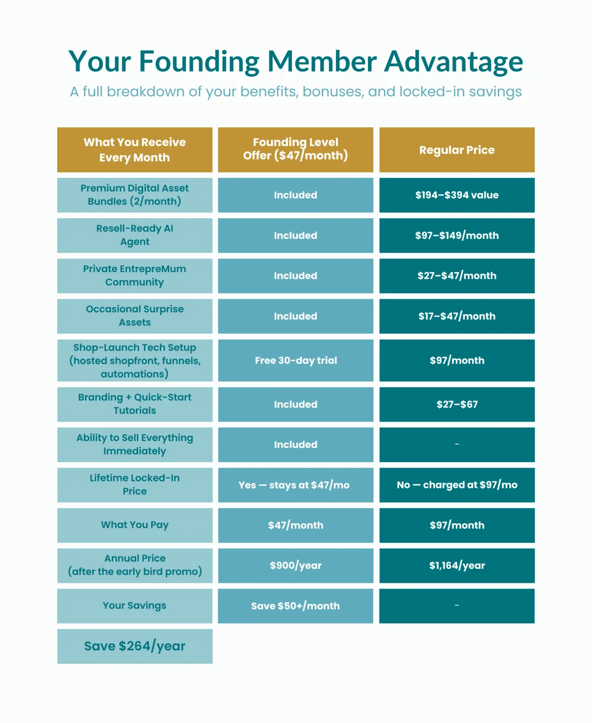 Secure a full year for less than the price of four months at the regular $97/month rate.